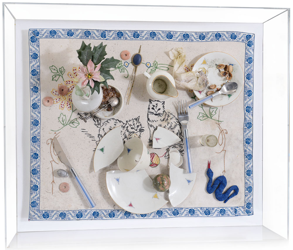 assemblaggio di oggetti e collage su tavola cm. 52x61x16, firma, titolo, anno e località (Vienna) al retro, dichiarazione d'autenticità dell'artista su foto, entro teca in plexiglass.