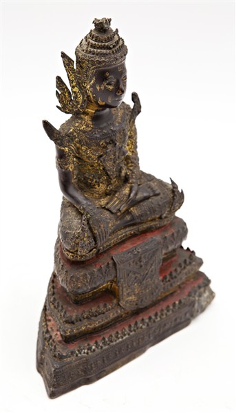 Lotto 1064 | Buddha in bronzo parzialmente dorato, assiso su un alto trono in dhyanasana, co