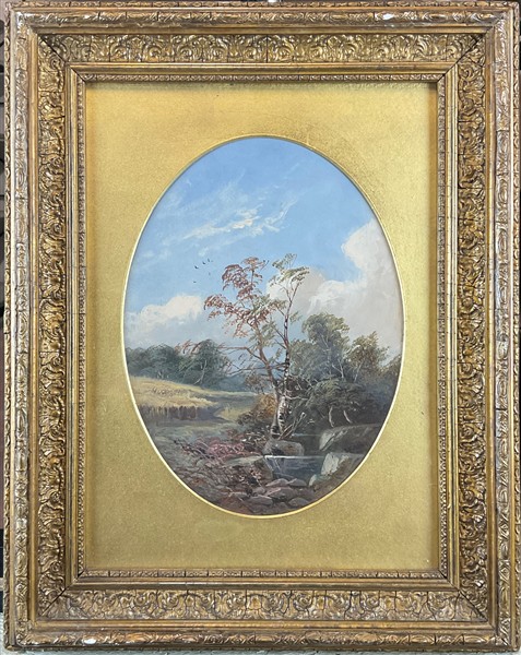 Scuola inglese "Coppia di scorci montani" olio su cartone ovale (cm 29x21) in