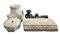 Lotto composto da un capitello in pietra scolpita con motivi a foglia (cm 43x40x43), una base circolare (cm 36x14x36), un fregio rettangolare con fascia scolpita (cm 73x13x36) e una colonna componibile in marmo verde con fusto rotto (difetti e mancanze)