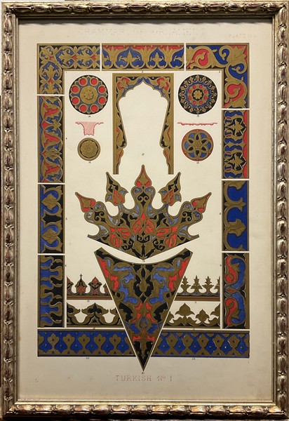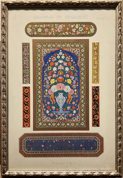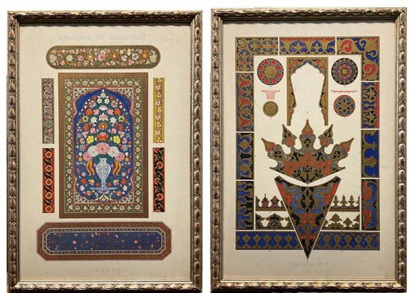 Coppia di litografie a colori raffiguranti motivi decorativi per pareti ed arredi indiani e turchi, tratte da "The Grammar of Ornament" di Jones Owen pubblicato per la prima volta nel 1856 (fogli cm 56x37) In cornici (lievi difetti)