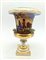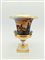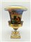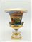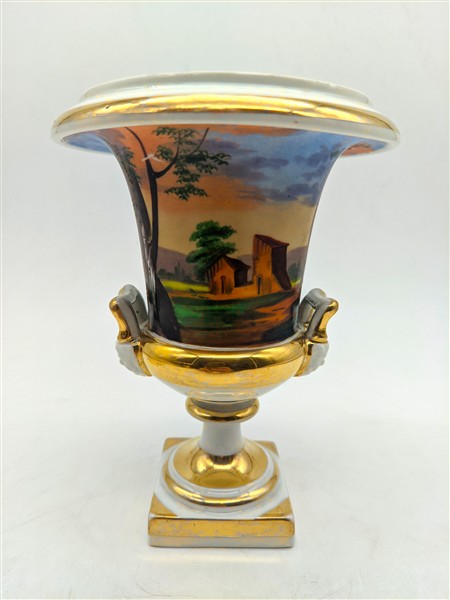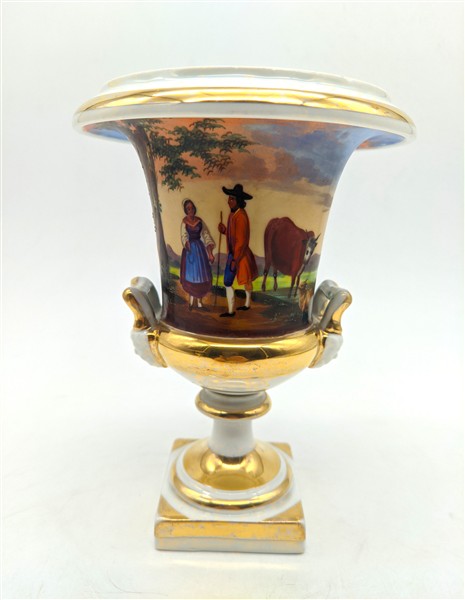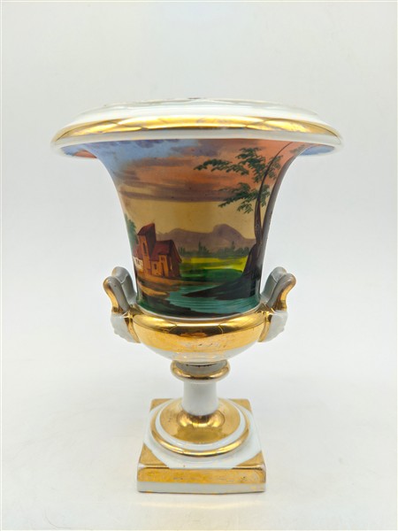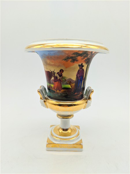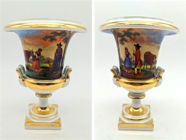 Manifattura del secolo XIX. Coppia di vasi biansati in porcellana decorata in policromia con scene pastorali entro paesaggi profilati in oro (h max cm 22.5) (difetti)