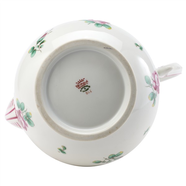 Manifattura Richard Ginori, secolo XX. Caffettiera piriforme in porcellana dipinta in policromia decorata da rose verdi e porpora, beccuccio zoomorfo. Marcata sotto la base, coperchio non pertinente (h. cm 23) (difetti)