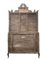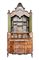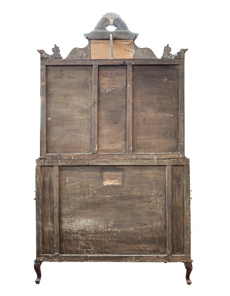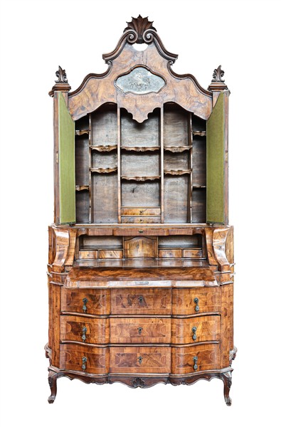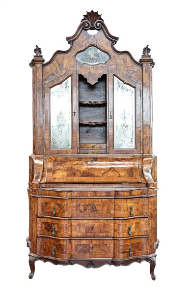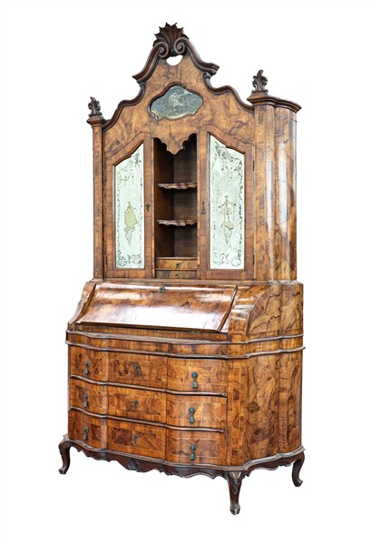 Trumeau in stile veneto settecentesco impiallacciato in noce e radica di noce, parte inferiore mossa a tre cassetti e calatoia che rivela quattro tiretti, antina e vani a giorno, parte superiore a due ante specchiate e incise, vano a giorno con ripiani e due tiretti, cimasa a volute centrata da specchio sagomato (cm 138x250x67) (difetti)