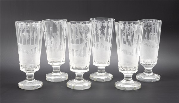 Lotto 1183 | Set di sei bicchieri a base ottagonale in cristallo inciso e acidato con scene