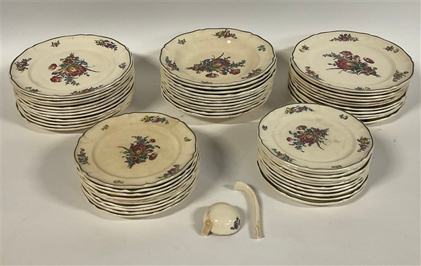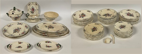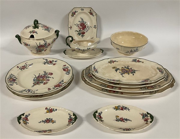 Manifattura di Villeroy & Boch, 1918-1935. Parte di servizio da tavola in ceramica decorato in policromia a fiori composta da ventitré piatti piani, undici fondi, dieci medi, undici piccoli, una zuppiera con coperchio, un'insalatiera, una salsiera e nove diversi piatti da portata. (difetti)