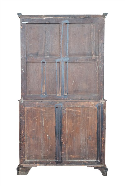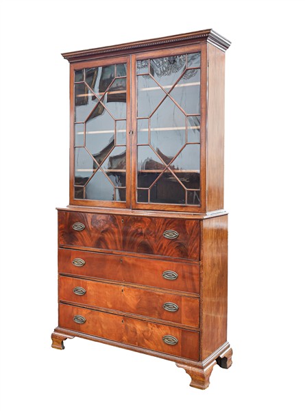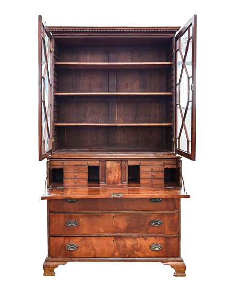 Bureau bookcase a due corpi in mogano e piuma di mogano, parte superiore con due ante a vetrina, parte inferiore a quattro cassetti di cui uno sottopiano ribaltabile e celante otto tiretti, vani a giorno, antina e segreti, piedi a mensola. Inghilterra, fine periodo georgiano, inizio secolo XIX (cm 118x218x42) (difetti)