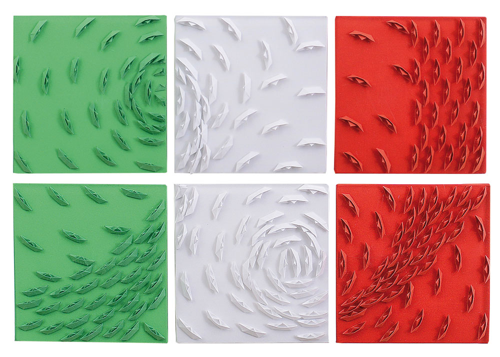 acrilici e barche di carta applicate su 6 tele cm. 20x20 cadauna cm. 40x60 totali entro 2 teche in plexiglass, firma al retro dell'opera verde della teca inferiore, dichiarazione d'autenticità e archivio dell'artista su foto.