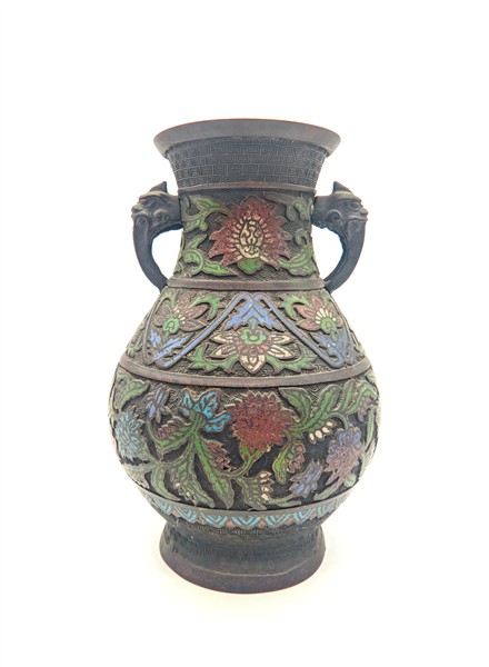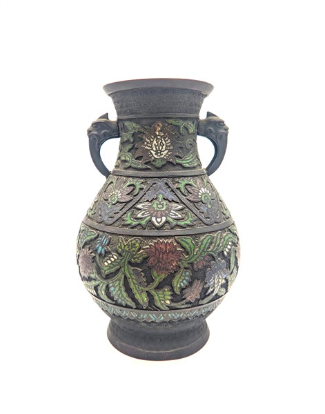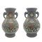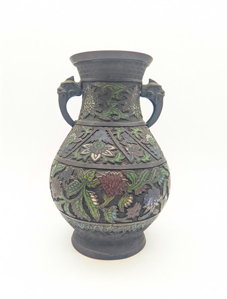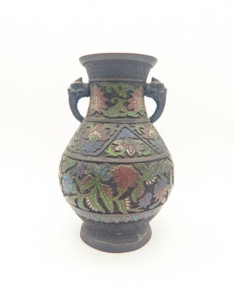 Coppia di vasi biansati in metallo cloisonné, secolo XX (h cm 29,5) (difetti)