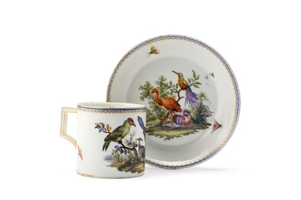 Manifattura di Meissen, 1790-1800 circa. Tazza con piattino in porcellana policroma decorata da volatili e insetti, profilo cordonato in blu e oro (tazza h cm 7; piattino d cm 14) (difetti)