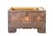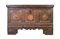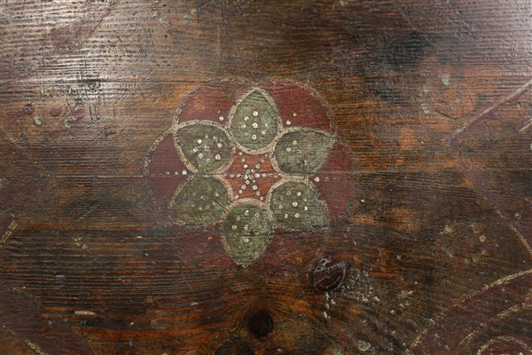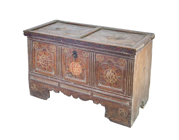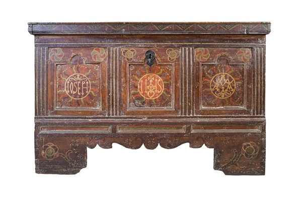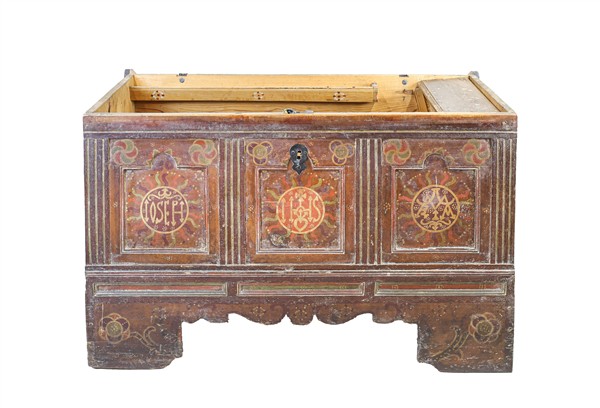 Cassone in legno dipinto e decorato in policromia da simboli religiosi e florea
