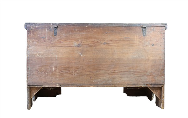 Cassone in legno dipinto e decorato in policromia da simboli religiosi e floreali entro riserve, grembiale sagomato e piedi a mensola. Secolo XIX (cm 120x75x59) (difetti)