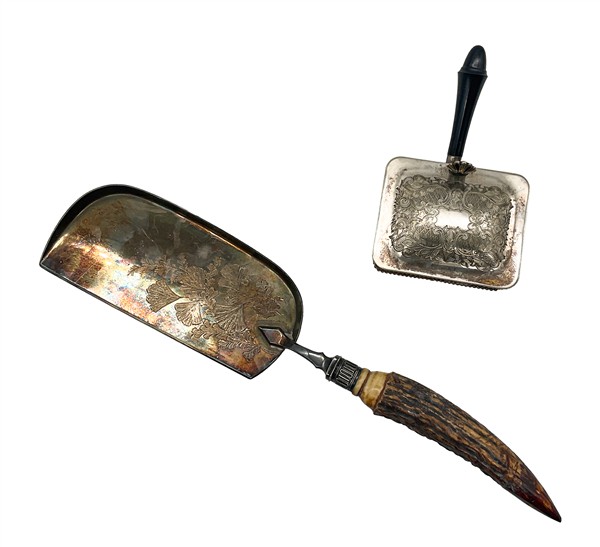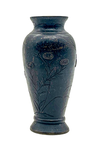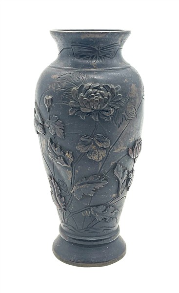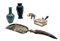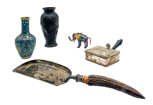 Lotto composto da un vasetto e un elefantino in metallo cloisonné, un vasetto i bronzo decorato in rilievo e due raccoglibriciole in metallo argentato (L max cm 36) (difetti)