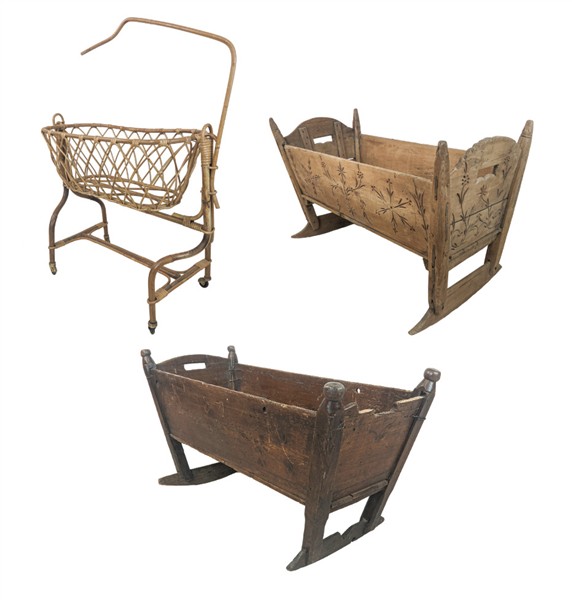 Lotto composto da tre diverse culle in legni vari, di cui una in bambù e midoll