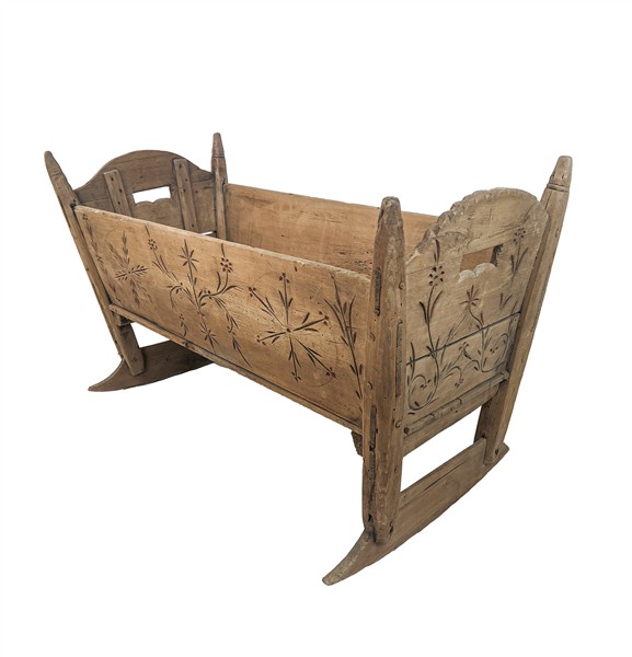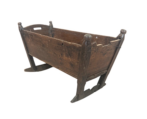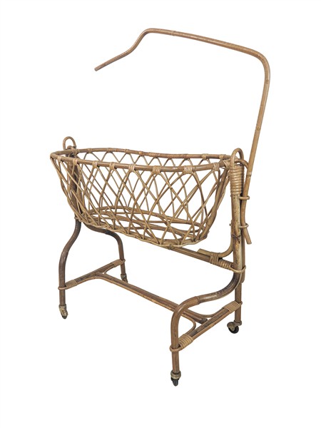 Lotto composto da tre diverse culle in legni vari, di cui una in bambù e midollino (L max cm 96) (difetti e mancanze)