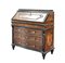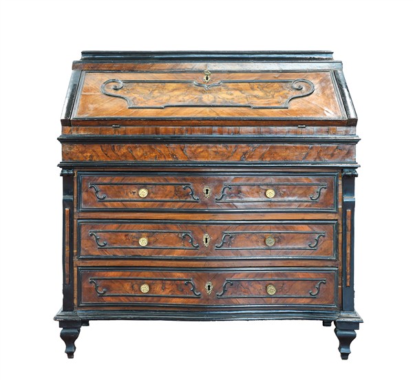 Ribalta lastronata in noce e radica con profili ebanizzati, fronte mosso a tre cassetti e calatoia celante sei tiretti e piano scorrevole, piedi a balaustro. Lombardia, secolo XVIII (cm 112x115x52) (difetti e restauri)