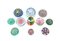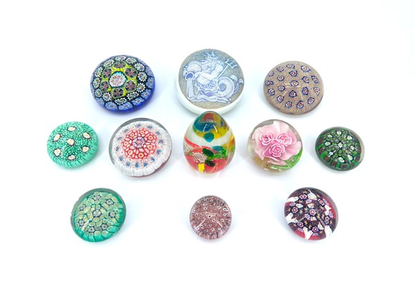 Gruppo di undici diversi fermacarte in vetro sommerso con murrine policrome di diverso decoro e forma (d max cm 10) (lievi difetti)