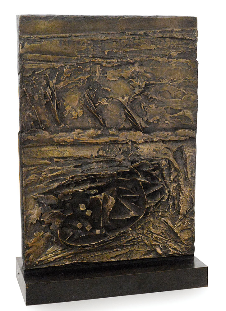 scultura in bronzo cm. 59x42,5, esemplare 2/3, firma, anno e tiratura sul bordo destro in basso, dichiarazione d'autenticità dell'artista e Archivio Arnaldo Pomodoro (MI) su foto.