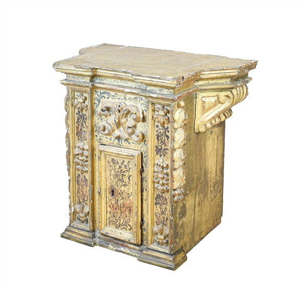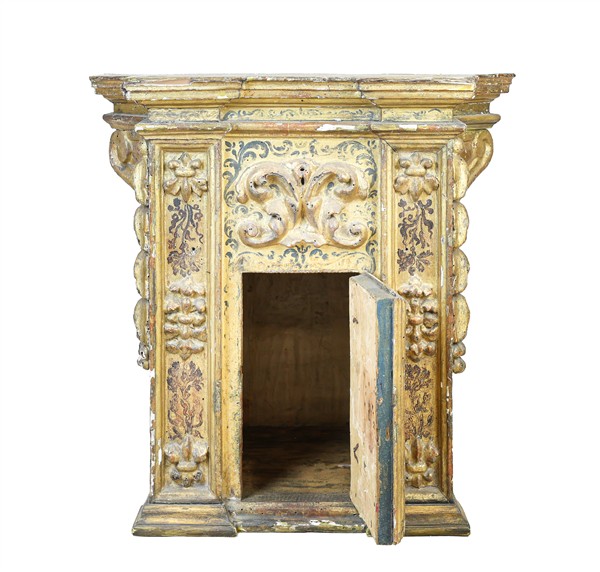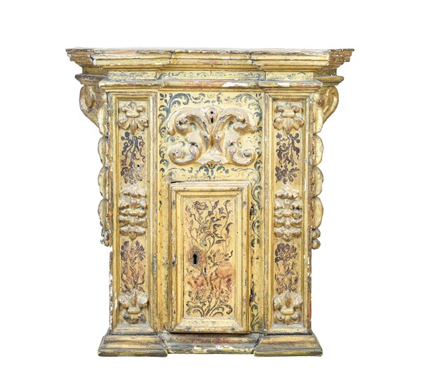 Arte del secolo XVII. Tabernacolo di struttura architettonica in legno intagliato, dipinto e dorato con sportello, decori a volute a rilievo e floreali policromi (cm 63x59x40) (difetti e restauri)