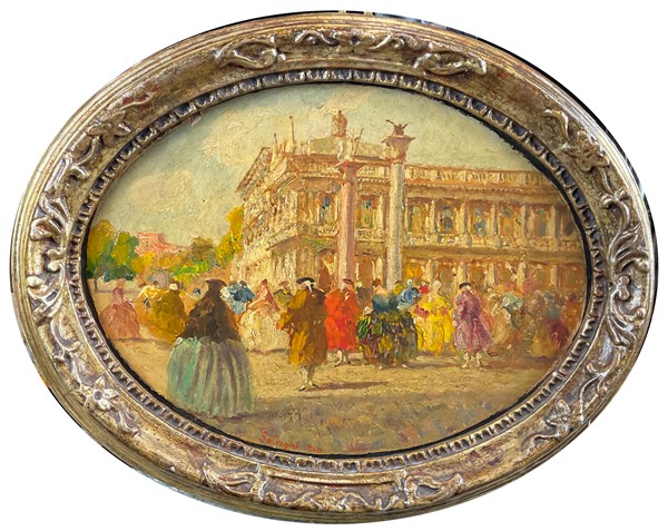Ettore Solvegni "Carnevale a Venezia" 1910 olio su compensato (cm 23x31,5) firma