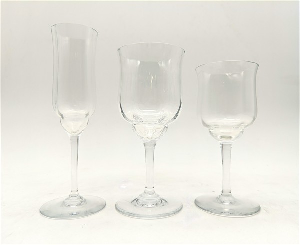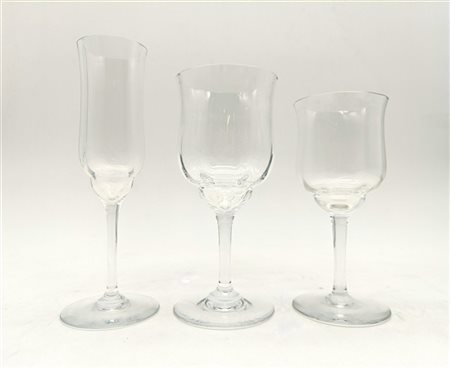 Modello Capri. Servizio di calici in cristallo composto da dodici bicchieri da acqua, dodici da vino e dodici flute. Marchio a tampone sul fondo (lievi difetti)