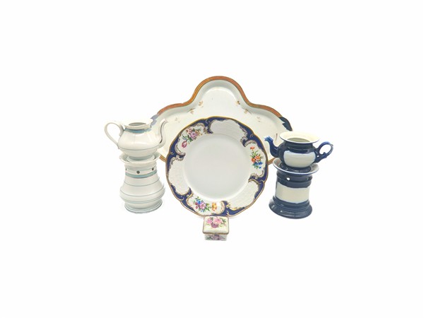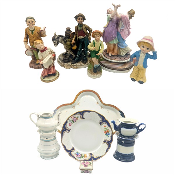 Cartone contenente numerosi oggetti per la tavola in ceramica e piccole sculture con personaggi di manifatture differenti (difetti)