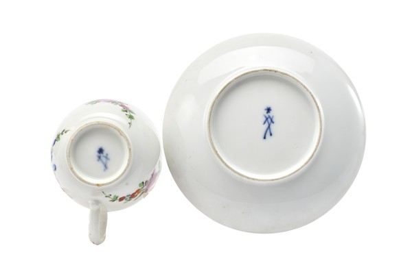 Manifattura di Meissen, secolo XIX. Quattro tazzine con piattini in porcellana decorata a fiori policromi (h cm 4; d cm 10) (difetti, una tazzina con felature)