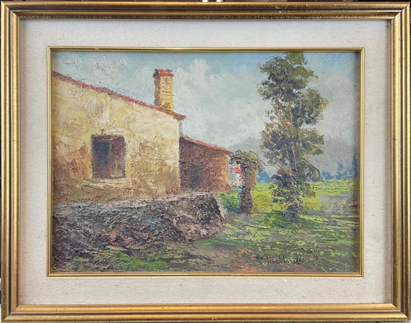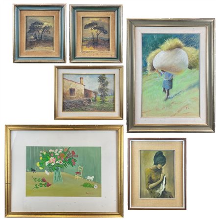 Lotto composto da tre oli su tela, uno su compensato e due tecniche miste su carta, di autori, soggetti e misure diverse (misura max cm 49x34) tutti firmati