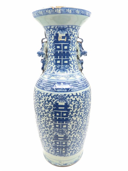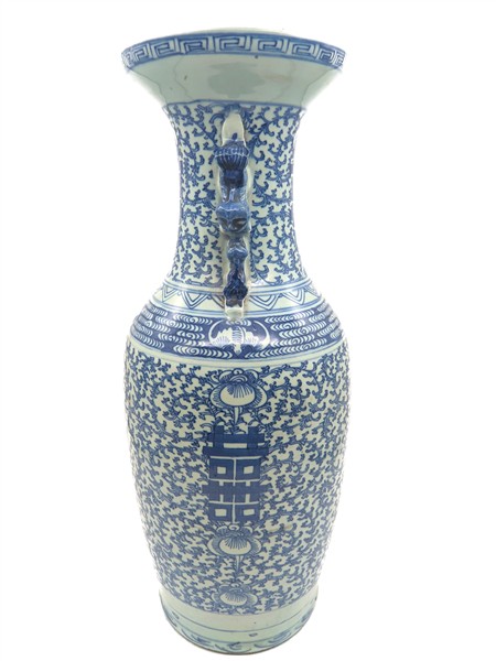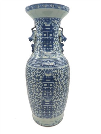 Vaso biansato in porcellana bianca e blu, anse in forma di cane di Pho. Cina, secolo XX