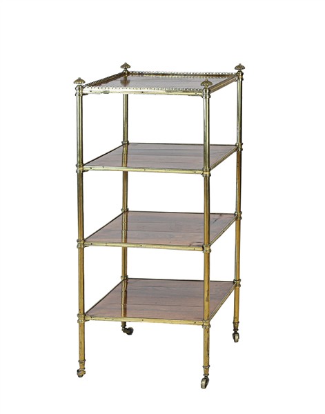 Etagère a quattro ripiani in mogano e ottone con piedi su ruotine e pinnacoli b