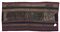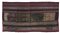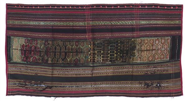 Tessuto composto da due fasce laterali di area turcomanna e all’interno una fascia ricamata Djia Djim con motivi geometrici nei toni del rosso, rosa e giallo su fondo nero con personaggi antropomorfi (cm 129x63) (difetti e strappi)