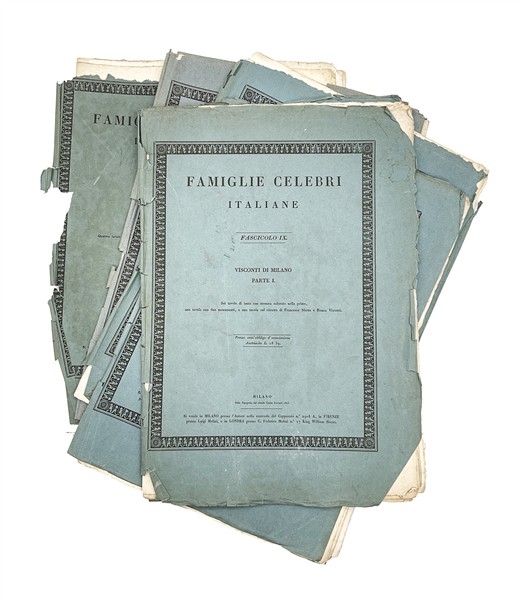 Lotto di cinque fascicoli inerenti la famiglia Visconti di Milano con all'interno numerose tavole in bianco e nero e alcune a colori inerenti la famiglia (difetti)