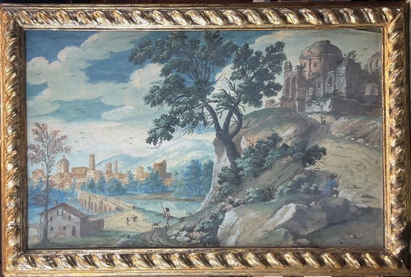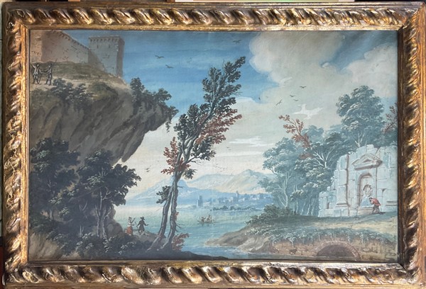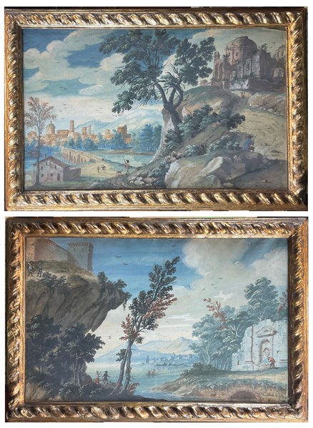 Coppia di dipinti raffiguranti "Paesaggio con figure" e "Paesaggio lacustre con figure"