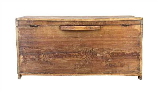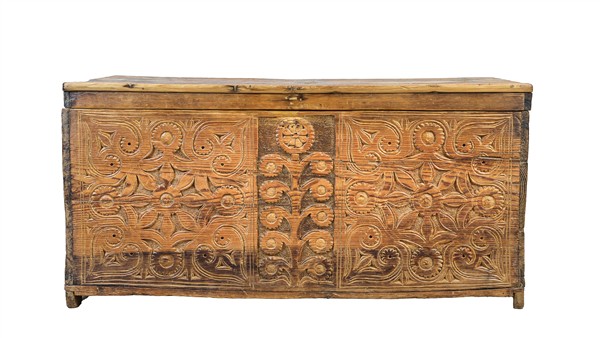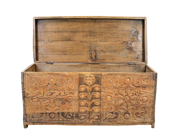Cassapanca in legno dolce con fronte decorato da intagli a fondo ribassato con