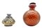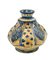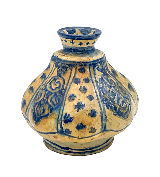 Vaso portafiori in ferro dipinto e dorato. India, secolo XIX. Unito ad un piccolo vaso "huqqa base" in ceramica bianca e blu di manifattura islamica, probabilmente del secolo XVII (h max cm 21) (difetti e restauri)