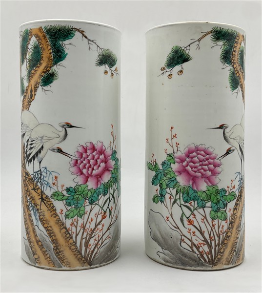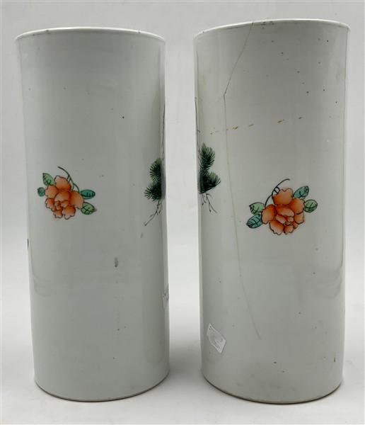 Coppia di porta pennelli in porcellana Famiglia Rosa decorati con volatili e mo