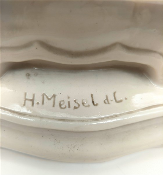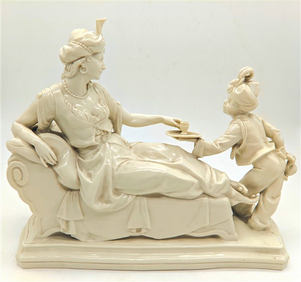 Gruppo in porcellana bianca raffigurante "Sultana e moretto", firma "H. Meisel d.L." a lato e marchi impressi sotto la base.