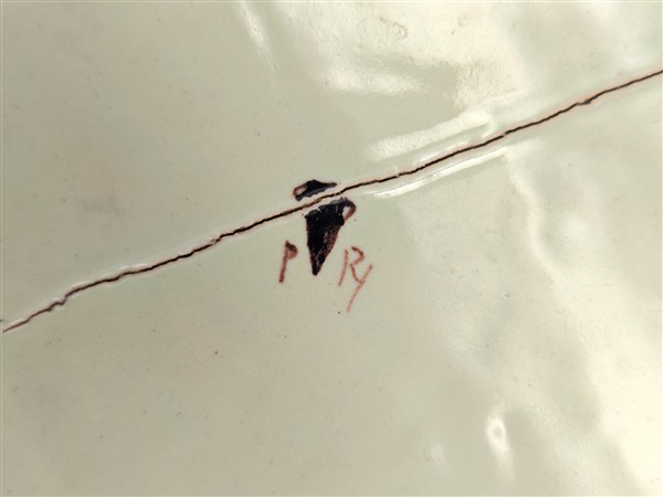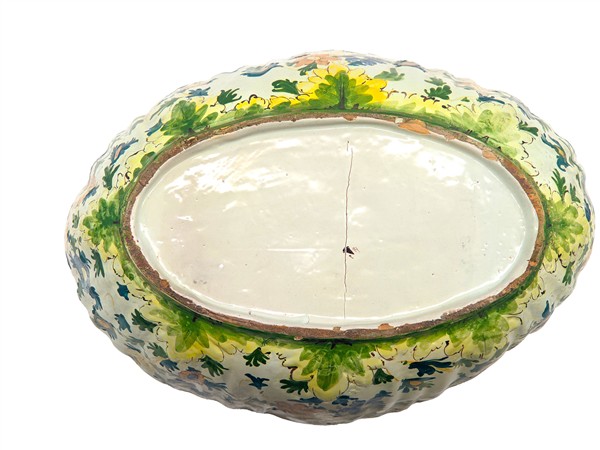 Bacile in maiolica dipinta in policromia con motivo "al tacchiolo" di forma ovale baccellata (cm 56x16x41) (difetti)