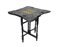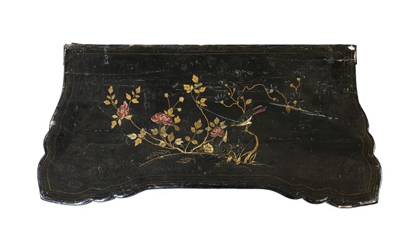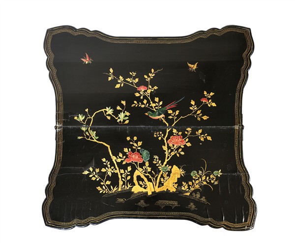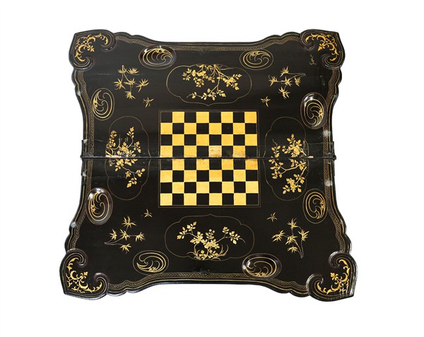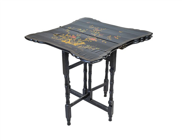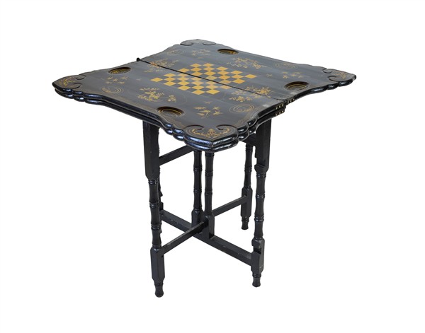 Tavolino da gioco in legno laccato con gambe tornite, doppio ripiano incernierato, un lato centrato da scacchiera con vani portapenne, l'altro a decori naturalistici. Secolo XIX (cm aperto 79x78x81) (difetti)