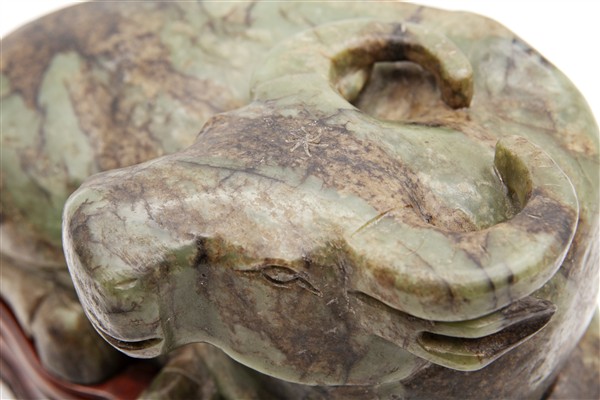Intaglio a foggia di Bufalo accucciato in giada verde screziata russet Cina, s