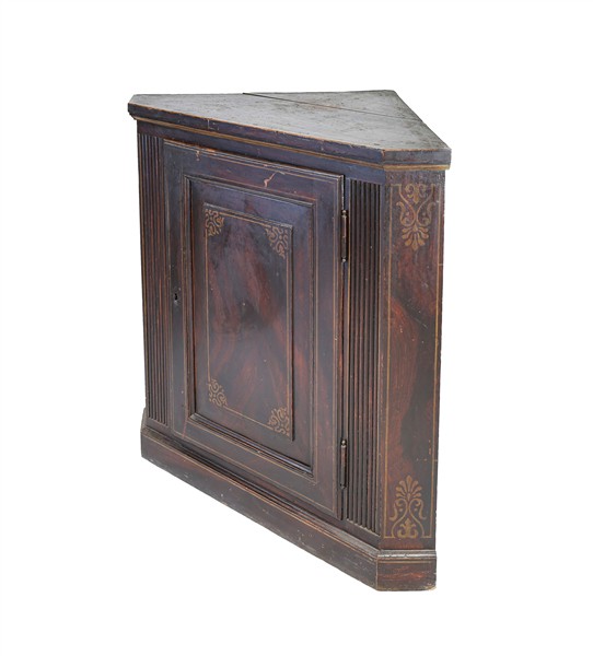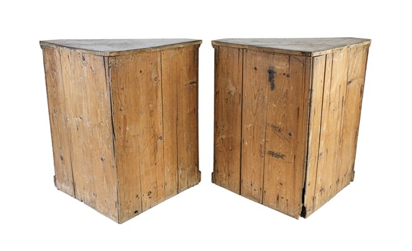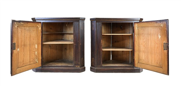 Coppia di cantonali in legno dipinto ad un'anta pannellata e lesene baccellate. Secolo XIX (cm 71x99x71) (difetti)