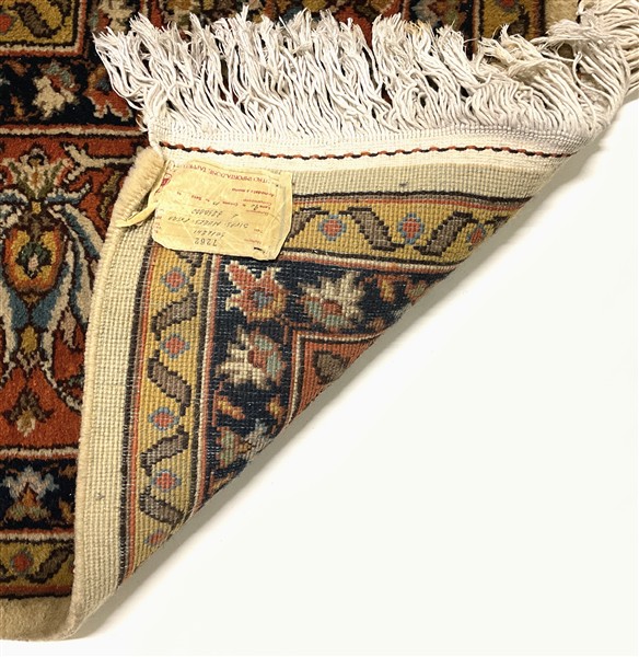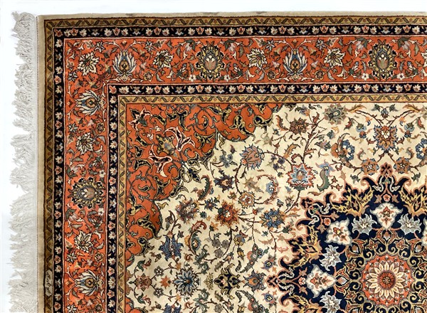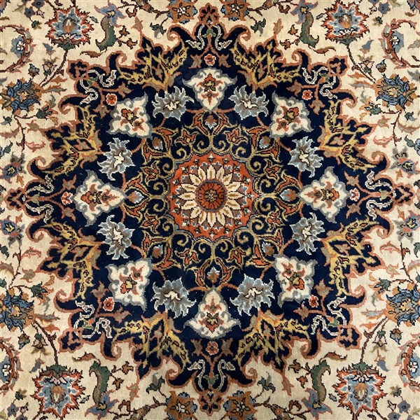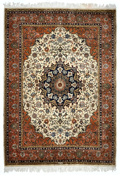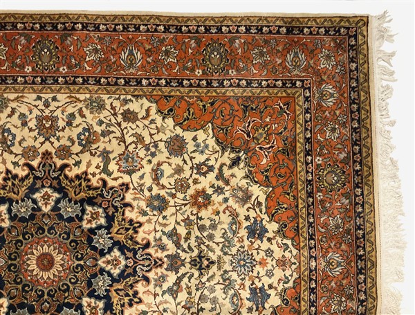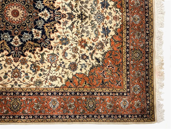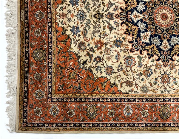 Tappeto romeno, recente manifattura. Decoro con medaglione polilobato policromo su fondo bianco cosparso di rami fioriti (cm 302x240) (difetti)
