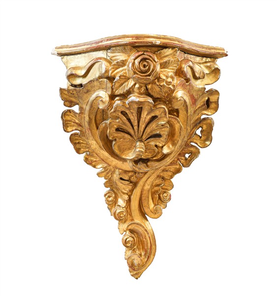 Mensola angolare in legno intagliato e dorato a volute fiorite e palmetta. Seco