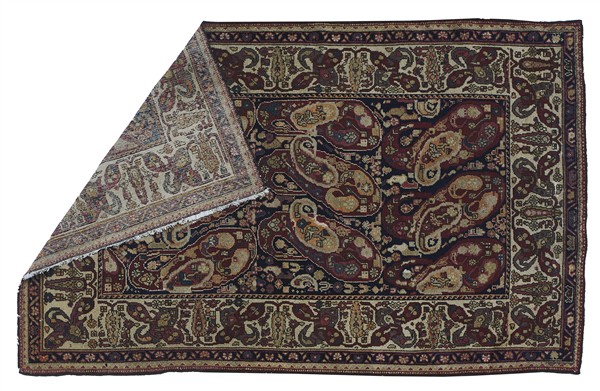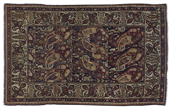 Tappeto Serabend, Persia, fine secolo XIX. Decoro con file di Boteh madre e figlia nei toni del rosso, beige e blu su fondo blu notte. Bordura a meandro con cipressi e Boteh su fondo bianco (cm 202x125) (difetti)
