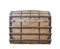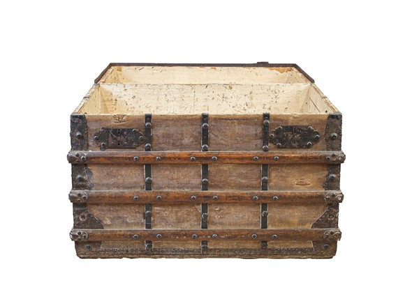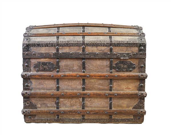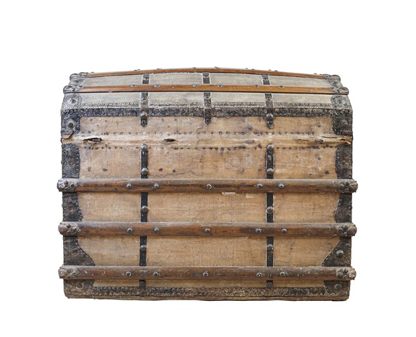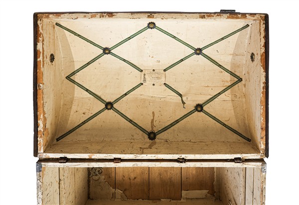 Baule rivestito in tela con borchie e rinforzi in ferro. Secolo XIX (cm 92x71x5