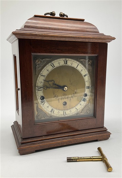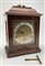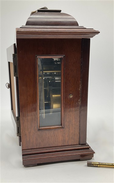 Orologio d'appoggio con cassa in legno e quadrante a fascia argentata a numeri romani. Movimento a tre treni con suoneria del tipo "Westminster" e scappamento a bilancere (h. cm 30) (difetti)