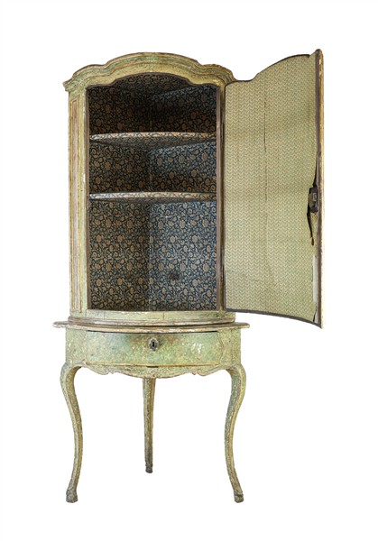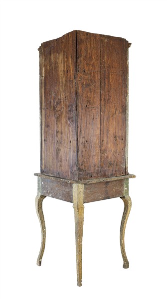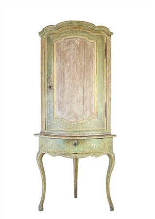 Angoliera a due corpi in legno laccato, parte inferiore con cassetto nella fascia e gambe mosse con piede caprino, parte superiore ad un'anta sagomata. Piemonte, secolo XVIII (cm 58x190x58) (difetti e mancanze)