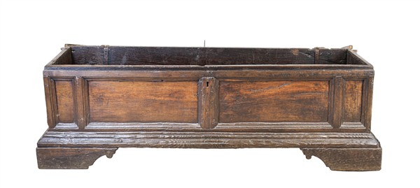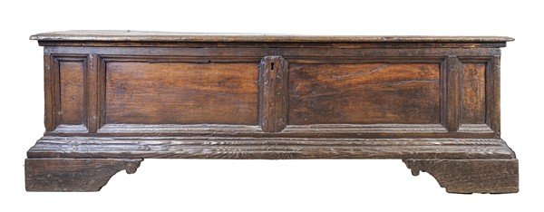 Cassapanca con fronte e montanti riquadrati e piedi sagomati a mensola. Secolo