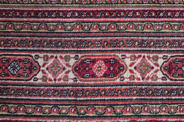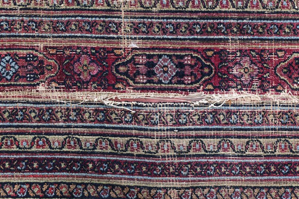 Tappeto Kohrassan, Persia, fine secolo XIX. Decoro Herati su fondo blu notte con molteplici bordure (cm 486x340) (difetti, rapature e strappi)