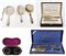 Lotto composto da un binocolo, due servizi da toilette ed uno da dolce in lamina d'argento ed altri materiali, in custodie originali (difetti e rotture)